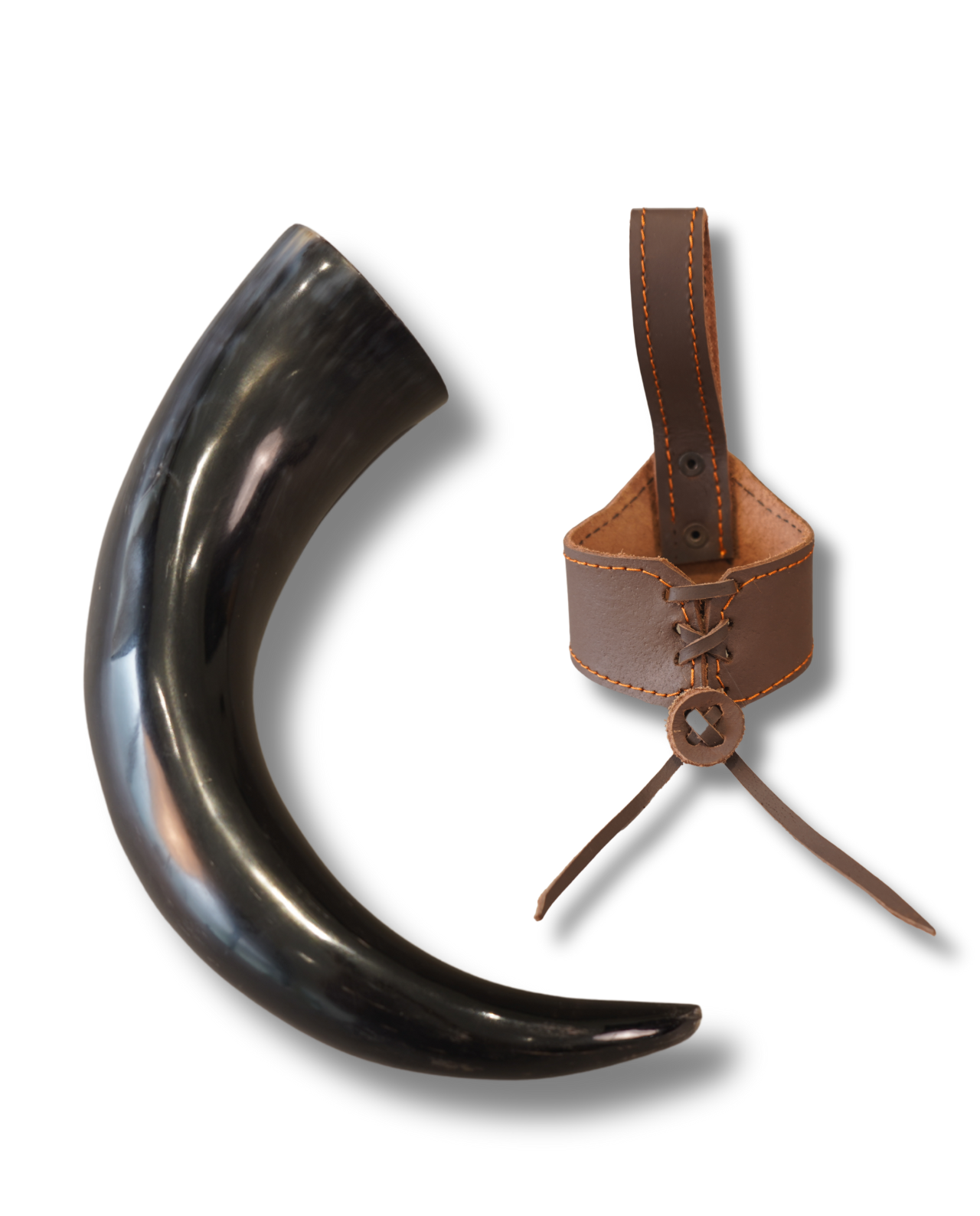 Each horn is individually handcrafted, showcasing natural color variations and organic curves that make every piece unique. The smooth interior is carefully finished for comfortable drinking, while the exterior retains a raw, rustic Viking appearance. The sturdy leather belt holder offers secure support and adds both functionality and authenticity for festivals and reenactment events.
